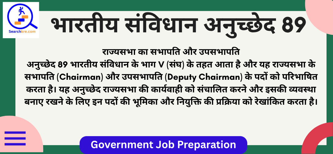 अनुच्छेद 89(1): उपराष्ट्रपति (Vice-President of India) राज्यसभा का सभापति होगा। यह प्रावधान उपराष्ट्रपति को राज्यसभा की कार्यवाही का संचालन करने की जिम्मेदारी देता है।
