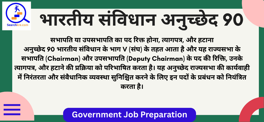 सभापति या उपसभापति का पद रिक्त होना, त्यागपत्र, और हटाना अनुच्छेद 90 भारतीय संविधान के भाग V (संघ) के तहत आता है और यह राज्यसभा के सभापति (Chairman) और उपसभापति (Deputy Chairman) के पद की रिक्ति, उनके त्यागपत्र, और हटाने की प्रक्रिया को परिभाषित करता है। यह अनुच्छेद राज्यसभा की कार्यवाही में निरंतरता और संवैधानिक व्यवस्था सुनिश्चित करने के लिए इन पदों के प्रबंधन को नियंत्रित करता है।