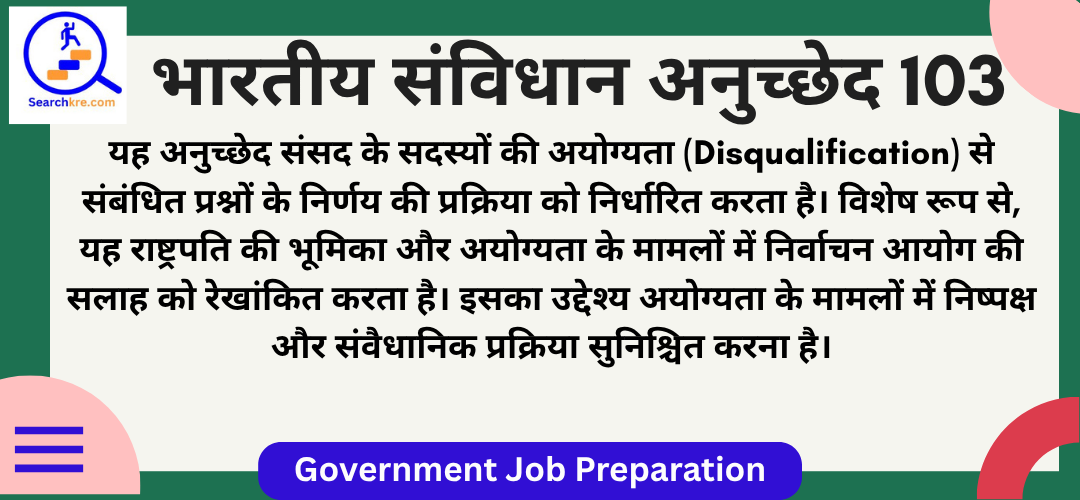 अनुच्छेद 103 का सार अनुच्छेद 103 भारतीय संविधान के भाग V (संघ) के अंतर्गत आता है। यह अनुच्छेद संसद के सदस्यों की अयोग्यता (Disqualification) से संबंधित प्रश्नों के निर्णय की प्रक्रिया को निर्धारित करता है। विशेष रूप से, यह राष्ट्रपति की भूमिका और अयोग्यता के मामलों में निर्वाचन आयोग की सलाह को रेखांकित करता है। इसका उद्देश्य अयोग्यता के मामलों में निष्पक्ष और संवैधानिक प्रक्रिया सुनिश्चित करना है।