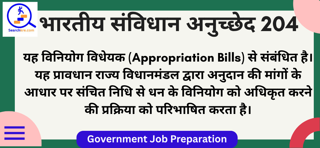 अनुच्छेद 204 भारतीय संविधान के भाग VI(राज्य) के अंतर्गत अध्याय IV(राज्य की कार्यपालिका) में आता है। यह विनियोग विधेयक(Appropriation Bills) से संबंधित है। यह प्रावधान राज्य विधानमंडल द्वारा अनुदान की मांगों के आधार पर संचित निधि से धन के विनियोग को अधिकृत करने की प्रक्रिया को परिभाषित करता है।