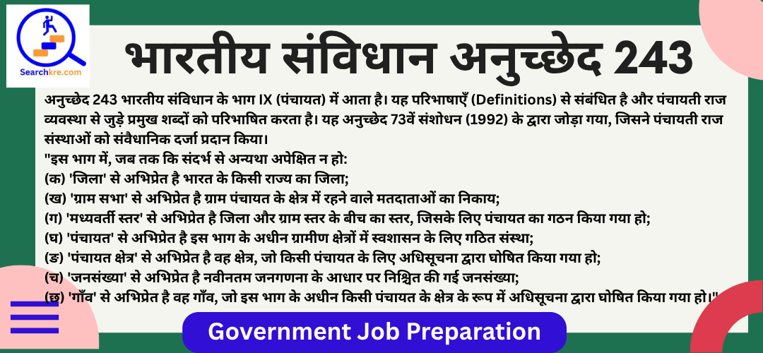 अनुच्छेद 243 भारतीय संविधान के भाग IX(पंचायत) में आता है। यह परिभाषाएँ(Definitions) से संबंधित है और पंचायती राज व्यवस्था से जुड़े प्रमुख शब्दों को परिभाषित करता है। यह अनुच्छेद 73वें संशोधन(1992) के द्वारा जोड़ा गया, जिसने पंचायती राज संस्थाओं को संवैधानिक दर्जा प्रदान किया।