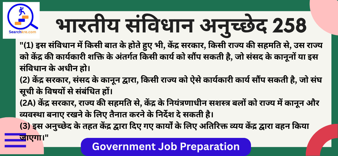 अनुच्छेद 258 भारतीय संविधान के भाग XI(केंद्र और राज्यों के बीच संबंध) के अध्याय II(प्रशासनिक संबंध) में आता है। यह केंद्र द्वारा अपनी कार्यकारी शक्ति का राज्यों को हस्तांतरण(Power of the Union to confer powers, etc., on States in certain cases) से संबंधित है। यह प्रावधान केंद्र को अपनी कुछ कार्यकारी शक्तियों को राज्यों को सौंपने या उनके साथ साझा करने की अनुमति देता है, ताकि प्रशासनिक कार्यों में समन्वय और दक्षता बढ़े। यह केंद्र और राज्यों के बीच सहकारी संघवाद को बढ़ावा देता है।