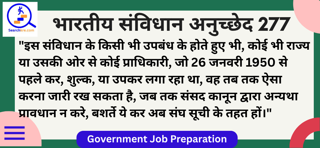 उद्देश्य: अनुच्छेद 277 का उद्देश्य राज्यों को उन करों, शुल्कों, या उपकरों को लगाने की शक्ति को बनाए रखने की अनुमति देना है, जो वे संविधान लागू होने से पहले(26 जनवरी 1950) लगा रहे थे, भले ही वे कर अब सातवीं अनुसूची की संघ सूची के तहत केंद्र की शक्ति में आ गए हों। यह प्रावधान राज्यों की वित्तीय स्वायत्तता की रक्षा करता है और संविधान लागू होने के बाद उनके राजस्व स्रोतों को अचानक समाप्त होने से बचाता है। इसका लक्ष्य संघीय ढांचे में केंद्र और राज्यों के बीच वित्तीय संतुलन और निरंतरता सुनिश्चित करना है।