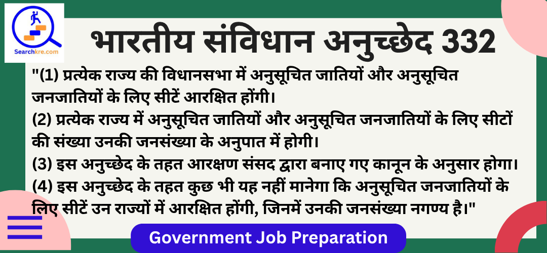 अनुच्छेद 332 भारतीय संविधान के भाग XVI (कुछ वर्गों के लिए विशेष उपबंध) में आता है। यह राज्य विधानसभाओं में अनुसूचित जातियों और अनुसूचित जनजातियों के लिए सीटों का आरक्षण (Reservation of seats for Scheduled Castes and Scheduled Tribes in the Legislative Assemblies of the States) से संबंधित है। यह प्रावधान सुनिश्चित करता है कि अनुसूचित जाति (SC) और अनुसूचित जनजाति (ST) समुदायों को प्रत्येक राज्य की विधानसभा में उनकी जनसंख्या के अनुपात में प्रतिनिधित्व मिले।