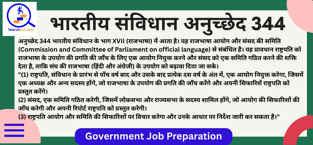 अनुच्छेद 344 भारतीय संविधान के भाग XVII (राजभाषा) में आता है। यह राजभाषा आयोग और संसद की समिति (Commission and Committee of Parliament on official language) से संबंधित है। यह प्रावधान राष्ट्रपति को राजभाषा के उपयोग की प्रगति की जाँच के लिए एक आयोग नियुक्त करने और संसद को एक समिति गठित करने की शक्ति देता है, ताकि संघ की राजभाषा (हिंदी और अंग्रेजी) के उपयोग को बढ़ावा दिया जा सके।