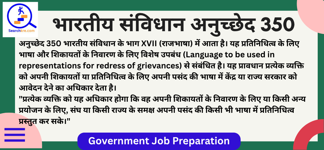 अनुच्छेद 350 भारतीय संविधान के भाग XVII (राजभाषा) में आता है। यह प्रतिनिधित्व के लिए भाषा और शिकायतों के निवारण के लिए विशेष उपबंध (Language to be used in representations for redress of grievances) से संबंधित है। यह प्रावधान प्रत्येक व्यक्ति को अपनी शिकायतों या प्रतिनिधित्व के लिए अपनी पसंद की भाषा में केंद्र या राज्य सरकार को आवेदन देने का अधिकार देता है।