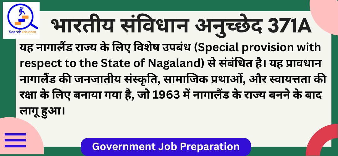 अनुच्छेद 371A भारतीय संविधान के भाग XXI (अस्थायी, संक्रमणकालीन और विशेष उपबंध) में आता है। यह नागालैंड राज्य के लिए विशेष उपबंध (Special provision with respect to the State of Nagaland) से संबंधित है। यह प्रावधान नागालैंड की जनजातीय संस्कृति, सामाजिक प्रथाओं, और स्वायत्तता की रक्षा के लिए बनाया गया है, जो 1963 में नागालैंड के राज्य बनने के बाद लागू हुआ।