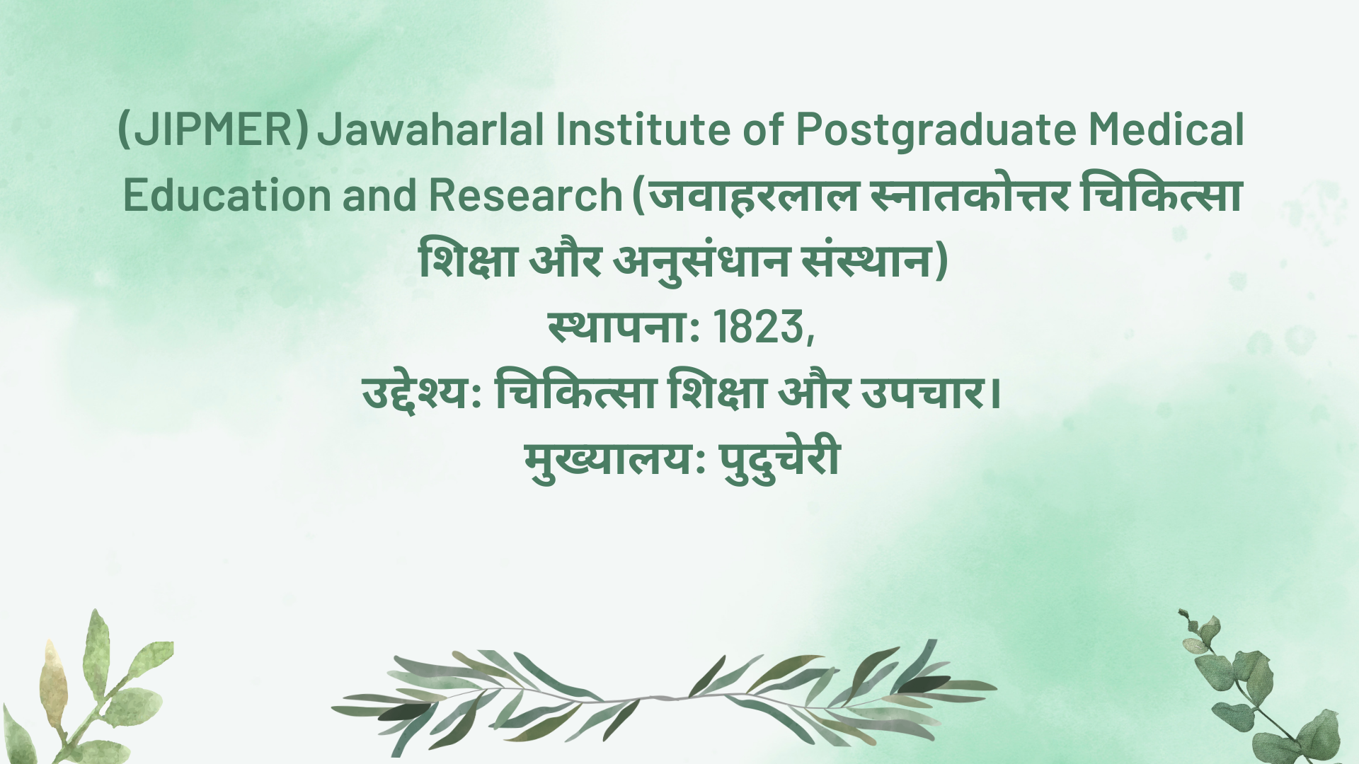 (JIPMER) Jawaharlal Institute of Postgraduate Medical Education and Research (जवाहरलाल स्नातकोत्तर चिकित्सा शिक्षा और अनुसंधान संस्थान)