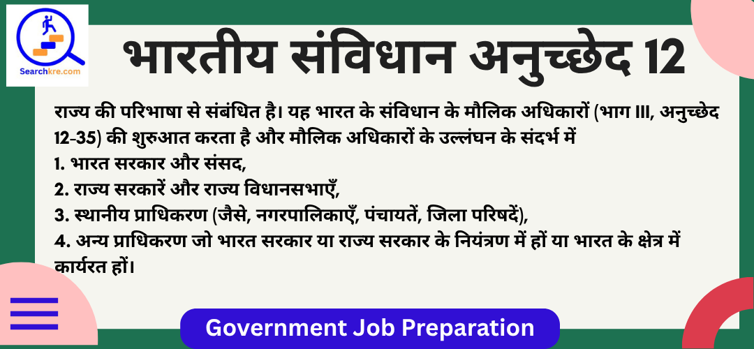 भारतीय संविधान का अनुच्छेद 12: राज्य की परिभाषा से संबंधित है। यह भारत के संविधान के मौलिक अधिकारों (भाग III, अनुच्छेद 12-35) की शुरुआत करता है और मौलिक अधिकारों के उल्लंघन के संदर्भ में