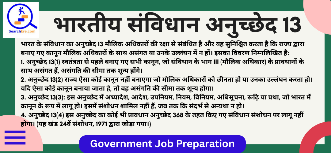 भारतीय संविधान का अनुच्छेद 13 मौलिक अधिकारों की रक्षा करता है और यह सुनिश्चित करता है कि कोई भी कानून, चाहे वह पुराना हो या नया, इन अधिकारों का उल्लंघन न करे।