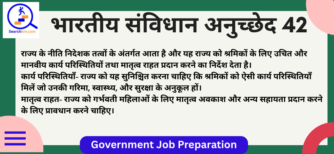 भारतीय संविधान का अनुच्छेद 42 राज्य के नीति निदेशक तत्वों के अंतर्गत आता है और यह राज्य को श्रमिकों के लिए उचित और मानवीय कार्य परिस्थितियों तथा मातृत्व राहत प्रदान करने का निर्देश देता है।